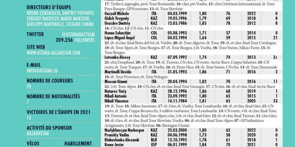 Autres sports Autres sports Astana Qazaqstan Team ANALYSE POINTS FORTS La république du Kazakhstan, qui a fêté ses trente ans, vit des temps difficiles, ce qui a un impact sur l'équipe, qui ne forme plus un bloc aussi puissant. Vincenzo Nibali et Miguel Ángel López ont connu les grands jours d'Astana et sont empreints de nostalgie. Ils reviennent au nid, après avoir …
