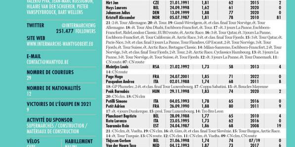 Autres sports Autres sports Intermarché-Wanty-Gobert Matériaux ANALYSE POINTS FORTS Une superbe Vuelta a procuré à Intermarché-Wanty-Gobert Matériaux l'attention positive que cette équipe au nom trop long méritait. Une victoire d'étape et neuf jours avec le maillot de leader réjouirait tout le monde, mais l'équipe s'est en plus distinguée par sa solidarité. Elle sait qu'elle ne compte pas parmi les favoris, mais …