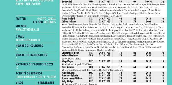 Autres sports Autres sports Lotto-Soudal ANALYSE POINTS FORTS De jeunes Belges pointent à nouveau leur nez chez Lotto Soudal. Depuis Paris-Roubaix, tout le monde connaît Florian Vermeersch. Idem pour Brent Van Moer après le Dauphiné. Les plans du manager John Lelangue semblent fonctionner. N'oubliez pas que Vermeersch a roulé la Vuelta juste avant Roubaix. La plupart des coureurs de 22 …