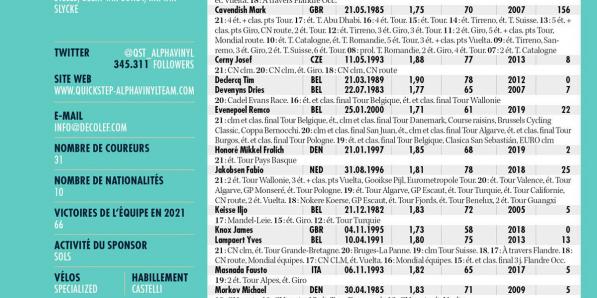 Autres sports Autres sports Quick-Step Alpha Vinyl Team ANALYSE POINTS FORTS Être fan de Quick-Step Alpha Vinyl, c'est regarder un film de Disney. Le casting peut varier, parfois la partie adverse semble sur le point de s'imposer, mais tout finit bien. De temps en temps, il se produit même de véritables miracles, comme le come-back de Mark Cavendish, ou celui de Fabio Jakobsen, …