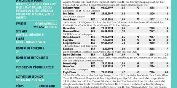 Autres sports Autres sports Jumbo-Visma ANALYSE POINTS FORTS Nous sommes à l'ère des super leaders et Jumbo-Visma en a au moins deux. Primoz Roglic gagne quasi tout ce à quoi il se consacre. Wout van Aert est un incroyable mélange d'endurance et de vitesse tout en ayant des jambes de grimpeur. L'équipe a des remplaçants valables à Roglic ( Tom …