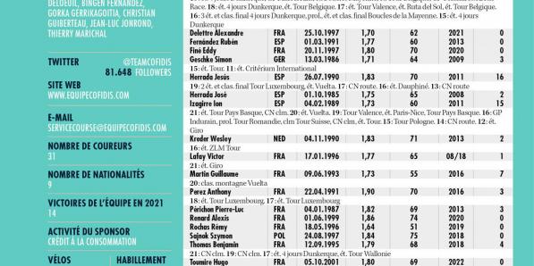 Autres sports Autres sports Cofidis ANALYSE POINTS FORTS Cofidis a inversé sa tenue habituelle: dorénavant, les manches sont blanches et le torse rouge. On a tendance à considérer la formation française comme une naine, mais c'est injustifié. Son budget est modeste mais elle gagne année après année, même si elle s'adjuge surtout des petites courses françaises. Un palmarès rehaussé par …