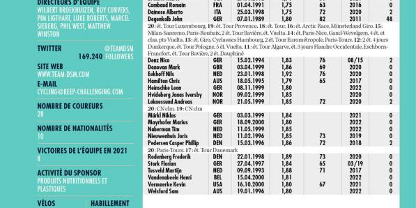 Autres sports Autres sports Team DSM ANALYSE POINTS FORTS Le Team DSM est sans doute le plus attentif aux jeunes. Il a l'art de dénicher des talents qu'il peut aisément enrôler, car il leur présente un dossier complet, qui comprend un plan de développement. Les Néerlandais s'appuient sur une philosophie éprouvée, dénuée d'improvisation, contrairement à certaines équipes. Ce travail leur permet …