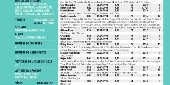 Autres sports Autres sports UAE Team Emirates ANALYSE POINTS FORTS Est-il encore possible de contrer la suprématie de Tadej Pogacar? UAE a bétonné le maillot jaune par ses investissements sur le marché des transferts. Le Slovène est désormais assisté par des ténors des tours tels que João Almeida, Marc Soler et George Bennett, alors qu'il disposait déjà de Rafal Majka et de …