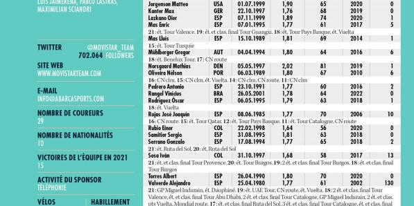 Autres sports Autres sports Movistar Team ANALYSE POINTS FORTS Une longue carrière peut faire de vous une légende, mais le palmarès d' Alejandro Valverde suffit à lui seul à lui offrir une place dans l'histoire. El Imbatido va fêter ses 42 ans, mais il est animé par la même ambition qu'il y a vingt ans. Enric Mas a bien travaillé sa …