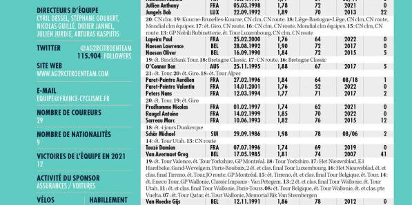 Autres sports Autres sports AG2R-Citroën Team ANALYSE POINTS FORTS AG2R-Citroën considérait 2021 comme une année de transition. Les Français ont gagné une étape dans les trois grands tours, "dépassant les espoirs" du management. On ne s'attendait pas davantage à ce que Ben O'Connor termine le Tour de France à la quatrième place. L'Australien y est parvenu en prenant la roue des …