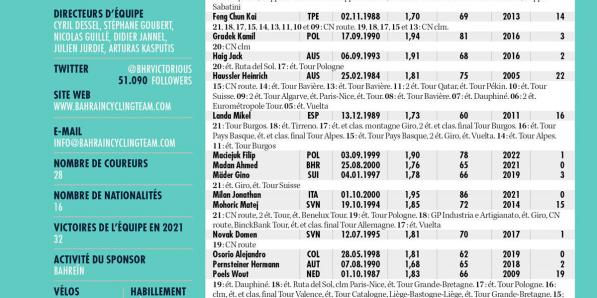 Autres sports Autres sports Bahrain Victorious ANALYSE POINTS FORTS Sonny Colbrelli a été la révélation de l'année, même si à 31 ans, il est depuis longtemps dans le peloton. Celui qui aurait prédit qu'il gagnerait Paris-Roubaix aurait été un fameux pronostiqueur. Colbrelli a réalisé qu'il était assez fort pour faire la course et qu'il ne devait pas nécessairement miser sur le …