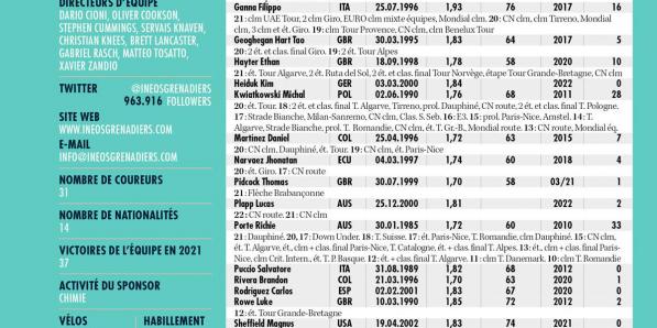 Autres sports Autres sports Ineos Grenadiers ANALYSE POINTS FORTS Tout est parfaitement au point: le matériel, les entraîneurs, l'encadrement et les coureurs. Les réserves des réserves des coureurs qui ratent de peu la sélection pour le Tour seraient leaders dans n'importe quelle autre équipe. Le cyclisme est toujours discret quant à ses budgets, mais la livre britannique pèse lourd: seules quelques …