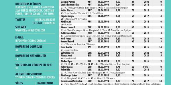Autres sports Autres sports Bora-Hansgrohe ANALYSE POINTS FORTS Les Allemands ont puisé dans leurs poches pour enrôler Jai Hindley, Sergio Higuita et Aleksandr Vlasov, des grimpeurs d'environ 25 ans, tous un cran en-dessous de l'élite absolue, mais dotés d'une marge de progression. Ils ont récupéré Sam Bennett, libéré par Patrick Lefevere. Ce sont là quatre transferts intéressants, qui doivent conférer …