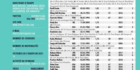 Autres sports Autres sports EF Education - Easy Post ANALYSE POINTS FORTS Jonathan Vaughters sait que son budget ne lui permet pas d'acheter les talents les plus convoités. L'Américain doit donc être convaincant et faire des paris. Parfois avec un énorme succès, comme grâce à Stefan Bissegger, qui est déjà, à 23 ans, le meilleur dans l'exercice de niche du prologue. Le spécialiste des …