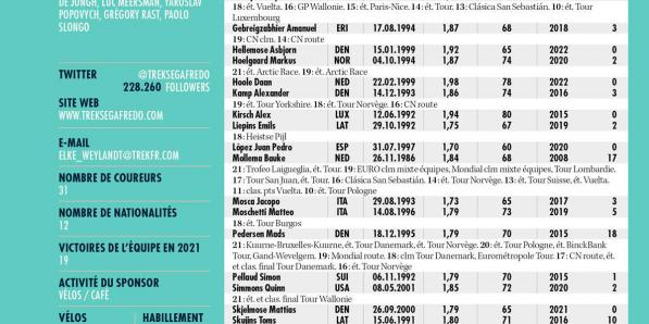 Autres sports Autres sports Trek-Segafredo ANALYSE POINTS FORTS Trek-Segafredo a rajeuni son noyau pour soutenir Jasper Stuyven et Mads Pedersen pendant le printemps, et compte des lieutenants qui regorgent d'expérience ( Tony Gallopin, Dario Cataldo). Le Belge et le Danois ont atteint l'âge idéal, le temps de la récolte. Les Américains attachent toutefois autant d'importance aux résultats des dames. Trek-Segafredo …