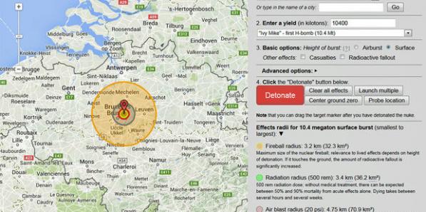 Sciences Sciences Et si une bombe nucléaire tombait sur votre commune? De la bombe bricolée par des terroristes à la dernière ogive russe de 100 mégatonnes, le site Nukemap permet de découvrir les dégâts occasionnés par un engin nucléaire lâché sur votre région.